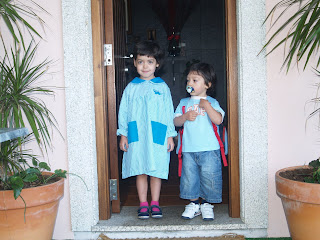A Maria, foi muito bem os primeiros dois dias. Depois, ainda em casa começava a choradeira, que não queria ir para a escola, que queria ficar comigo, que ia sentir muitas saudades minhas e do pai, que não, que não, que não... Depois lá entrava no carro sempre com os olhos razos de água, e repetindo sempre: "Mamã, és tão linda. Vou sentir tantas saudades... O tempo custa tanto a passar..." Cortavam o meu coração estas palavras, no entanto sabia que não devia vacilar, que não podia voltar com ela para casa... Se há dias que poderia ficar com ela, há também os outros que não, não posso ficar com ela, e não pode deixar de acompanhar o ritmo do infantário... E vieram então os tais dias, que foram os avós a levá-los. A partir daí não havia menina. Além de não ficar a chora, portava-se lindamente todo o dia.